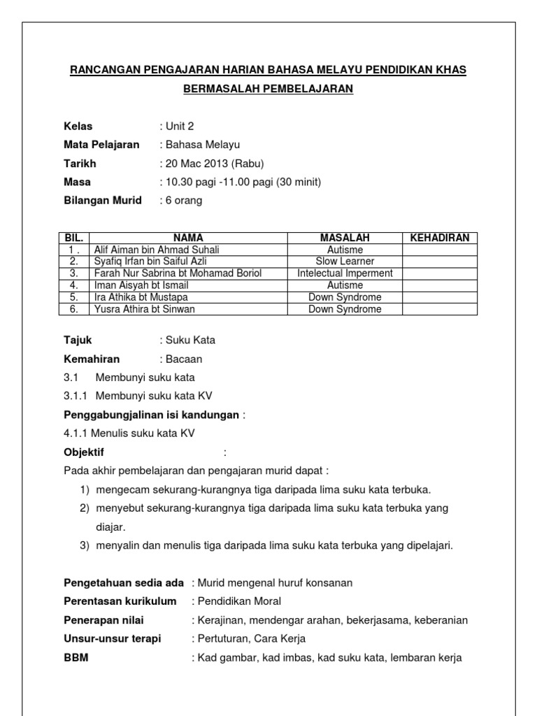 Rph Pendidikan Khas Masalah Pembelajaran Sekolah Rendah