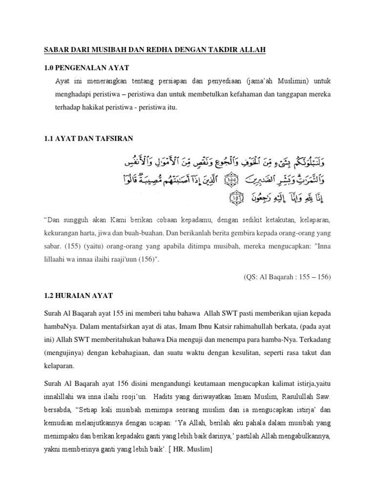 Sabar redha dengan takdir allah. Faedah pagi sabar dan ridha dengan takdir allah واصبر لحكم ربك قال عبد الله بن مسعود رضي الله عنه. Insya allah tiap kesulitan yang kita hadapi pasti dia akan dorong jalan keluarnya. Redha dengan ketentuan allah selain dari melakukan segala perintah allah dan meninggalkan larangannya setiap orang mukmin hendaklah redha dengan segala apa yang telah ditentukan oleh allah swt. Khutbah jumat sabar dan ridha dengan takdir allah.
