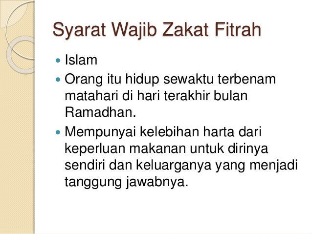 Sebutkan syarat wajib zakat fitrah. Zakat fitrah adalah zakat yang diwajibkan bagi seluruh umat muslim sebelum hari raya idul fitri tiba dengan syarat syarat yang telah ditetapkan besarnya zakat setara dengan 2 5 kg makanan pokok beras di indonesia. Beragama islam dan merdeka. Nonmuslim tidak ada kewajiban. Syarat wajib zakat fitrah islam selalu mengajarkan kepada setiap umatnya untuk terus menjadi manusia yang baik dan lurus di jalan allah.