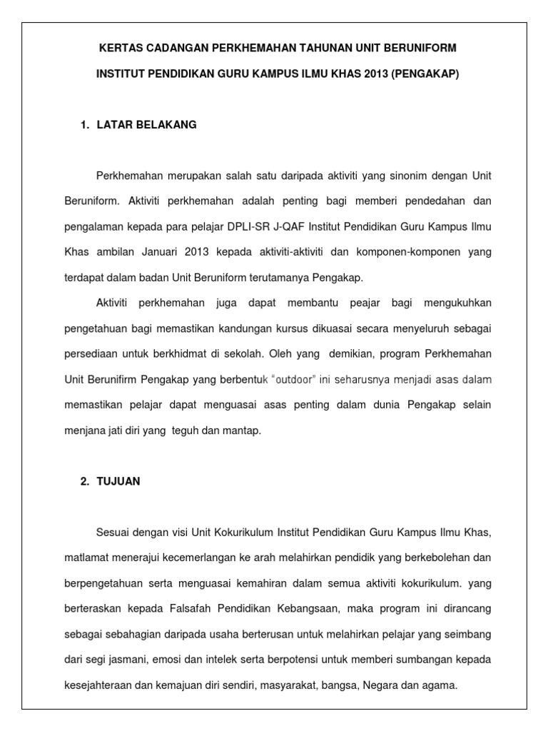 Contoh Kertas Kerja Cadangan Perkhemahan Bersepadu Unit Beruniform Sk Samarahan Estate Wanpaklong Wan Wan Academia Edu