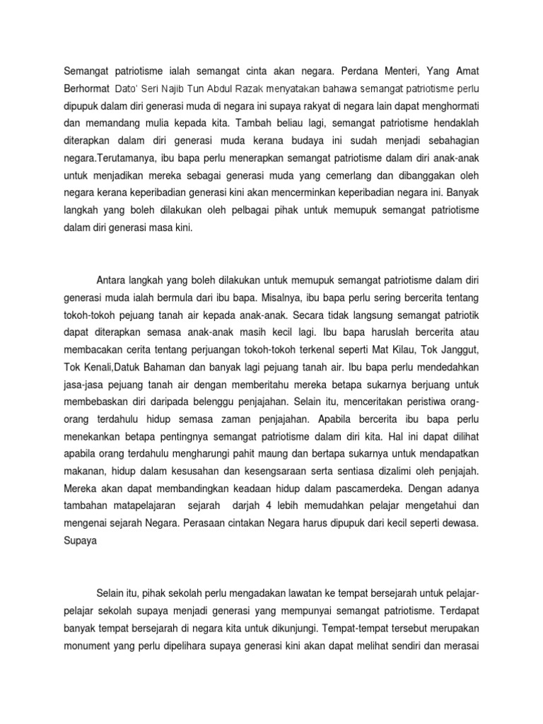 Walaupun kita terdiri daripada pelbagai kaum dan etnik semangat dan perjuangan kita tetap sama kerana kita semua adalah rakyat malaysia. Dengan wujudnya semangat cinta akan negara di kalangan rakyat pasti negara akan terus aman dan damai. Kaedah ni dapat menggalakkan pelajar pelajar untuk terus mempraktikkan dan memahami sikap semangat cinta akan negara sehingga mereka dewasa. Maka berikut dikongsikan contoh karangan langkah memupuk semangat patriotik dalam kalangan masyarakat untuk panduan semua.