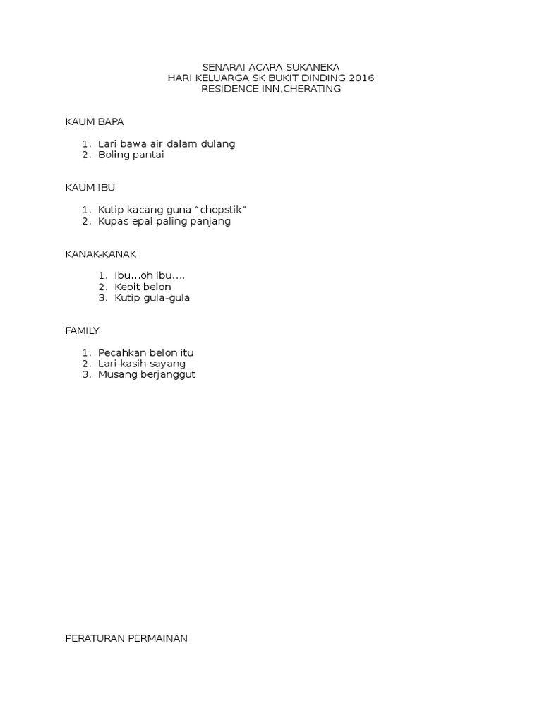 Berikut adalah senarai permainan sukaneka yang dimainkan oleh anak anak berumur antara 4 6 tahun di tadika tersebut. Pukulan yang paling sedikit dikira menang. Cabutan bertuah akan dibuat selang seli dgn acara lain tukar tukar hadiah setiap keluarga perlu membawa hamper hadiah berjumlah rm 20 kemudian hadiah akan diletakkan nombor dan akan dicabut kalau dapat number sama dgn hadiah sendiri perlu cabut semula. Gelang getah pula di taburkan di atas pasir.