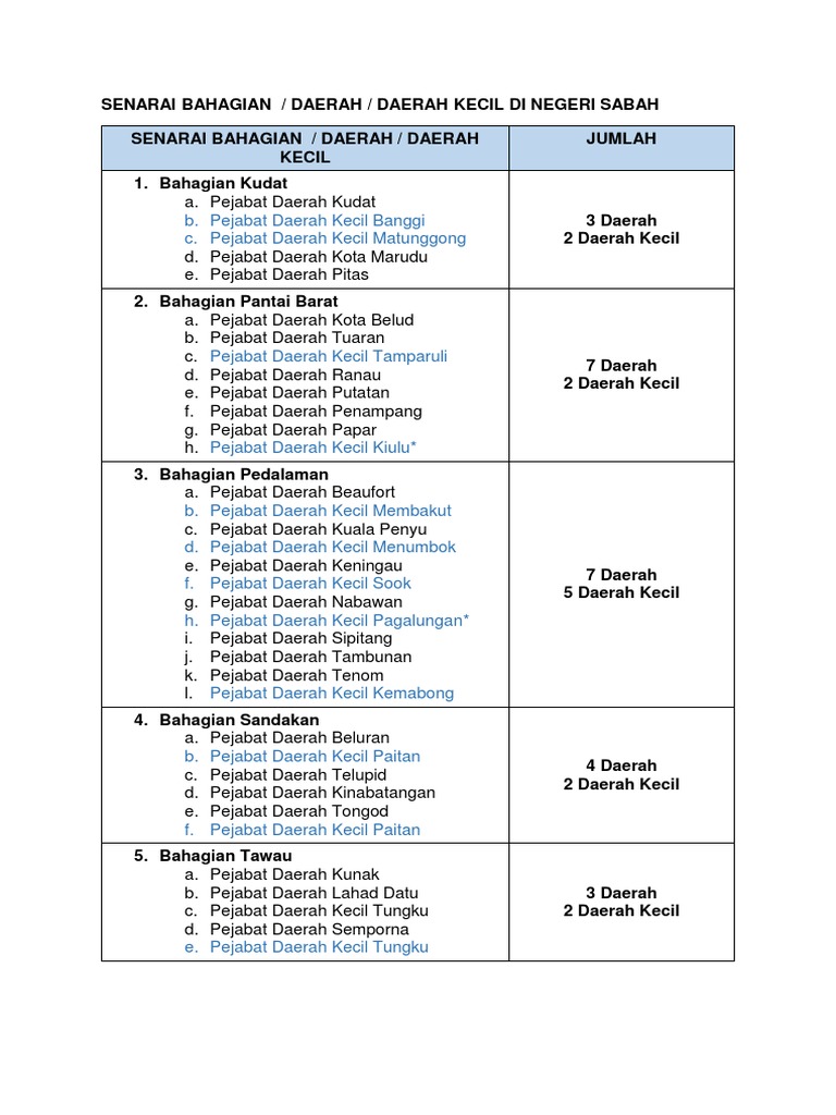 Daerah Sabah 1 Kota Kinabalu 2 Tawau 3 Sandakan 4 Lahad Datu 5 Keningau 6 Kinabatangan 7 Semporna 8 Papar 9 Penampang 10 Beluran 11 Tuaran 12 Ranau 13 Course Hero