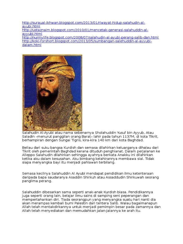 Sifat peribadi salahuddin al ayyubi banyak sikap baik dan mulia yang dimilik oleh salahuddin al ayyubi. سه لاحه دينێ ئه يووبى silhedînê eyûbî bahasa parsi. Memiliki misi visi yang jelas mampu melakukan semua tugasbijak dalam mengatur strategi perperangan helah sentiasa patuh kepada ajaran islamsentiasa berbincang dengan orang bawahan bercita cita tinggi bercita cita tinggi. Beliau dilahirkan pada tahun 532 h 1138 m di tikrit sebuah wilayah kurdi di utara iraq.