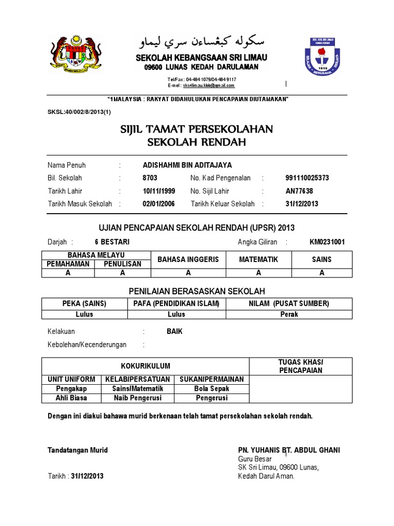 Sijil Tamat Sekolah Rendah Ahmed Baihaqi S Website
