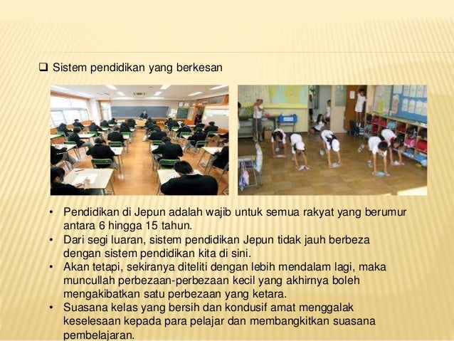 Ada banyak perkara yang boleh kita pelajari disana berkaitan cara pembelajaran dan perlaksanaan sistem pendidikan di jepun. Selepas perang dunia kedua undang undang asas pendidikan dan pendidikan sekolah undang undang telah digubal pada tahun 1947 di bawah arahan daripada pasukan pendudukan. Apa yang penting segala yang baik seharusnya diambil teladan dan cuba di praktik di negara kita. Kesannya terhadap teori dan.