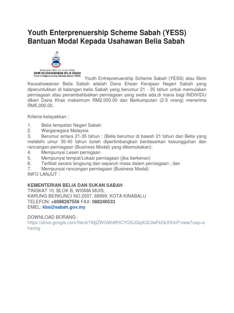 Youth Enterprenuership Scheme Sabah Yess Bantuan Modal Kepada Usahawan Belia Sabah Sumbermalaysia